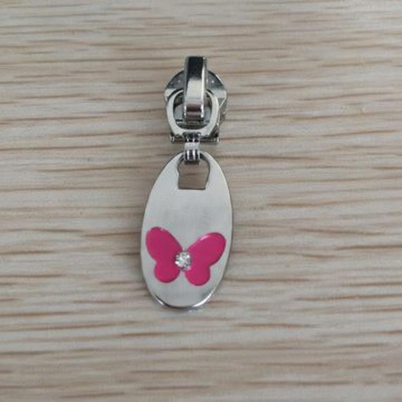 This wholesale fashion design zipper puller is crafted from durable brass with plating finish and rhinestone decoration for a stylish look. Designed for garments, bags, shoes, and other fashion items, it features an auto lock mechanism for secure fastening. Nickel‑free and customizable in size, shape, and color, it is ideal for fashion and commercial applications.
