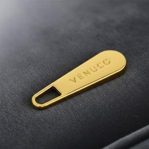 This gold metal zipper puller is made from durable alloy, iron, stainless steel, aluminum, copper, or brass, ideal for handbags, bags, and fashion accessories. Featuring die casting or stamping processing with multiple surface treatments like polishing, plating, brushing, printing, embossing, engraving, and painting, it is both stylish and longlasting. Available in standard or custom sizes for versatile use in commercial or personal projects.
