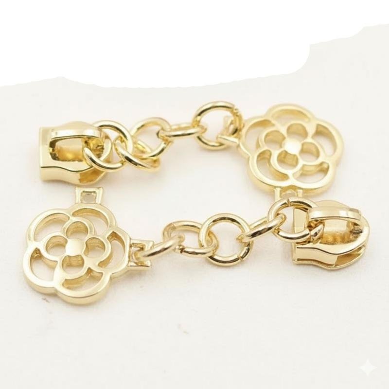 This zipper slider is crafted from durable zinc alloy with a golden plated finish. Featuring a decorative flower puller and non‑lock design, it ensures smooth functionality for garments and fashion accessories. Nickel‑free and washable, it combines durability with stylish appeal, making it a versatile choice for clothing applications.