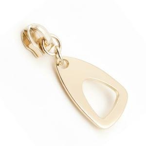 This zipper puller slider is crafted from durable zinc alloy with a golden plated finish. Featuring a non‑lock design, it ensures smooth functionality for garments and fashion accessories. Nickel‑free and washable, it combines durability with stylish appeal, making it a versatile choice for clothing applications.