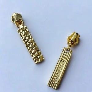 Highquality metal zipper slider puller made from durable zinc alloy with shiny gold plating. Features an autolock design and is available in multiple sizes. Ideal for handbags, garments, and fashion accessories.