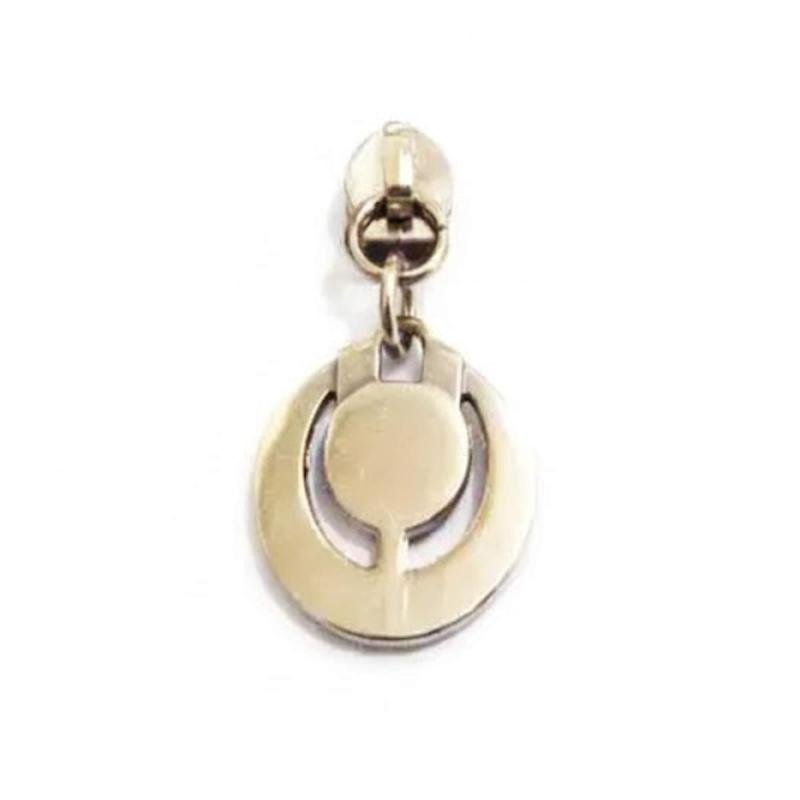 Specially designed metal zipper puller crafted with durable zinc alloy construction and plated finishing for handbag and luggage hardware applications.
