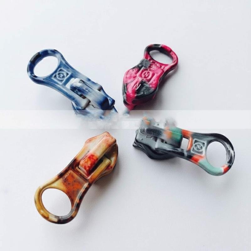 Highquality zinc alloy zipper puller with artistic water ink painting design. Features an autolock slider, ecofriendly, leadfree, nickelfree, and azofree. Available in multiple sizes, perfect for garments, bags, and fashion accessories.